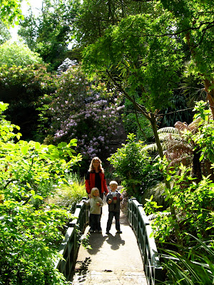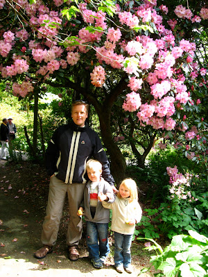 Glenfalloch Woodland Garden er kendt for sine mange rhodendendroner. Både de og roserne og stemningen var også dejlig. Ungerne er grebet af Mettes begejstring, dufter flittigt til blomster, viser vej i havens labyrint og stiller glade op til fotografering, naturligvis