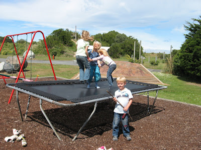Vi startede dagen med at spise morgenmad med Bodil, Tine, Lotte og Peter fra DK. Børnene legede dejligt sammen. De optrådte med cirkus, hvor de skiftedes til at lave flotte trampolinoptrædender. Lærke vandt Dunedin Campings internationale trampolinkonkurrence som hoppebolden. Det var sjovt. De store piger skabte en flot leg for alle. Nicolai lavede baglæns kolbøtter på trampoliner, da han så, at han måtte oppe sig noget med alle de dygtige piger. Vi nød at snakke og lege med dem.