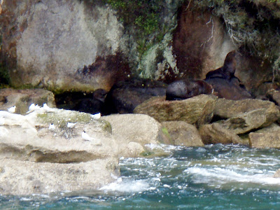 Vi sejlede forbi en skarvkoloni med 4-5 mdr gamle skarvunger, der sad på en stor sten ude i vandet hhv. gik inde på stranden og forsøgte at finde ud af, hvordan man er en skarv. Skarvene og mågerne holdt til på Split Apple Rock, som er en 135 mio år gammel granitsten, rund som et æble, der er splittet fint lige over i to, som et æble der er skåret over til madpakken.