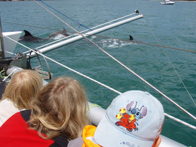 Delfiner har en lidt dragende effekt på os. De virker søde og kloge. Vi har haft en fantastisk oplevelse med at svømme med en delfin for ca. 8-9 år siden ud for Sinaiørkenen. Til shows er de imponerende med spring og stor fart og leg med trænerne. Nu fik vi så den enestående oplevelse at sejle på en 40-fods katamaran midt i en flok på 20-30 delfiner. Det var godt vejr.