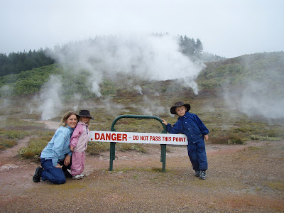 den sydlige del af Sydøen. Derfor også alle jordskælvene og alle bjergene vi har set. For ungerne er det helt nyt. For Christian og Mette minder det lidt om Island. Rotoroa på Nordøen er stedet, hvor jordskorpen bliver rigtig tynd. Her siges det, at selv gravene på kirkegården skal have skorsten på for at komme af med al dampen.