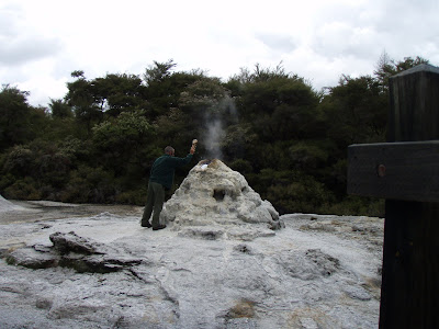 En vildt intensiv dag. kl 0830 ankom vi til Wai-O-Tapu – et spændende termisk område, hvor vi gik en 3 km lang tur mellem rygende huller med svovldampe, silicium mm. Nicolai gav stederne navne som djævlens hus/hul, djævlenes bade, djævleungernes legeplads etc. Han var vildt optaget af det.
