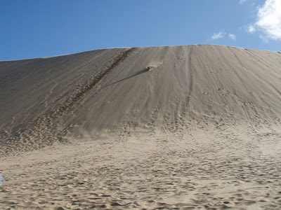 Wauv. Så fik vi prøvet ekstremsport. 150 m høje sandklitter. Det er faktisk utroligt højt, når man står lige nedenfor og lægger nakken tilbage og ser op. De kan være ubegribeligt stejle. Det mærkede vi rigtigt, da vi gav os til at vandre op af dem for at surfe og kælke ned. Christian tog den helt store tur på et surfbræt og fik suset af fart a la livet før børn. Vi grinede alle sammen meget og nød sandet. Lidt af en første dag i det nye år.